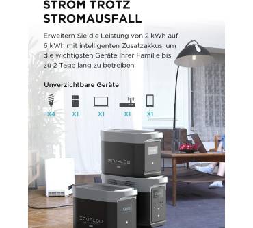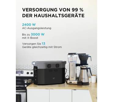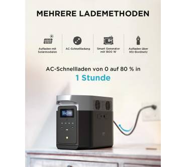 Die Powerstation von EcoFlow ist auf die Versorgung leistungsstarker Verbraucher ausgelegt. Ausgangsseitig steht Ihnen an vier 230-Volt-Steckdosen eine Gesamtleistung von bis zu 2.400 Watt, in der Spitze bis 4.600 Watt, zur Verfügung. Über eine spezielle Boost-Funktion können Sie Verbraucher mit einem Leistungsbedarf von bis zu 3.000 Watt betreiben. Zusätzlich nutzen Sie 2 Gleichstrom-Ausgänge, deren Spannungsniveau 12, 6 Volt beträgt. Mehrere USB-Ausgänge, darunter 2 USB-C-Ausgänge mit einer Maximalleistung von 100 Watt, runden das Spannungsangebot ab. Das Wiederaufladen ist sowohl über 230-Volt-Wechselspannung als auch über 12-Volt-Gleichstrom möglich. Die EcoFlow bietet darüber hinaus die Möglichkeit zum Wiederaufladen über Solar-Panels. Die Standard-Kapazität von 2 Kilowattstunden können Sie mit optional erhältlichen Zusatzakkus auf bis zu 6 Kilowattstunden erweitern. Die Steuerung der Station über das Internet ist mithilfe der herstellereigenen App ebenfalls möglich.