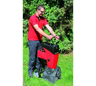 Stärken und SchwächenMit einer Leerlaufdrehzahl von 40 Umdrehungen pro Minute verursacht das als Leise-Häcksler eingestufte Gartengerät eine moderate Lärmbelastung von 93 Dezibel. Umsichtig betrieben sollte er damit kaum Anlass für nachbarschaftliche Verstimmungen bieten. Die Häckselwalze soll es mit Ästen bis zu einem Durchmesser von 40 Millimeter aufnehmen. Zur unproblematischen Beseitigung von Walzen-Blockaden steht eine Drehrichtungsumkehr zur Verfügung. Das Häckselgut wird nach unten hin ausgeworfen und kann in einem einfachen, im Lieferumfang enthaltenen Auffangsack aus Kunststoff gesammelt werden. Der mit einem Gesamtgewicht von knapp 25 Kilogramm nicht mehr leichte Häcksler lässt sich auf zwei Laufrollen aus Kunststoff an seinen Einsatzort befördern. Das aus Stahlrohr gefertigte Untergestell macht einen sehr leichten Eindruck und lässt einige Zweifel am sicheren Stand des Gartengeräts aufkommen.