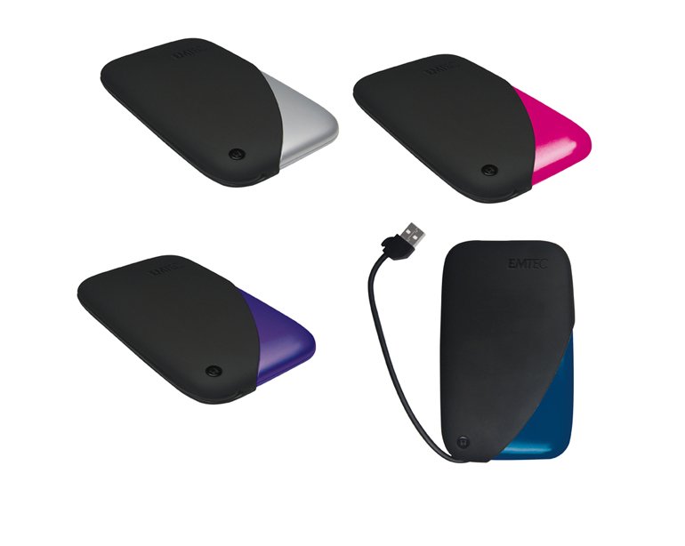 Emtec vertreibt demnächst mit der P200 eine externe Festplatte, die sich durch eine Designer-Note von der Masse der Konkurrentinnen abzuheben versucht. Eingepackt in einen asymmetrisch geschnittenen Gummiüberzug, der die Festplatte vor Stößen und Kratzern schützt, kann die Gehäusefarbe je nach Wunsch entweder in Schwarz, Blau, Silber oder für die Mutigen in Violett oder Pink gewählt werden.