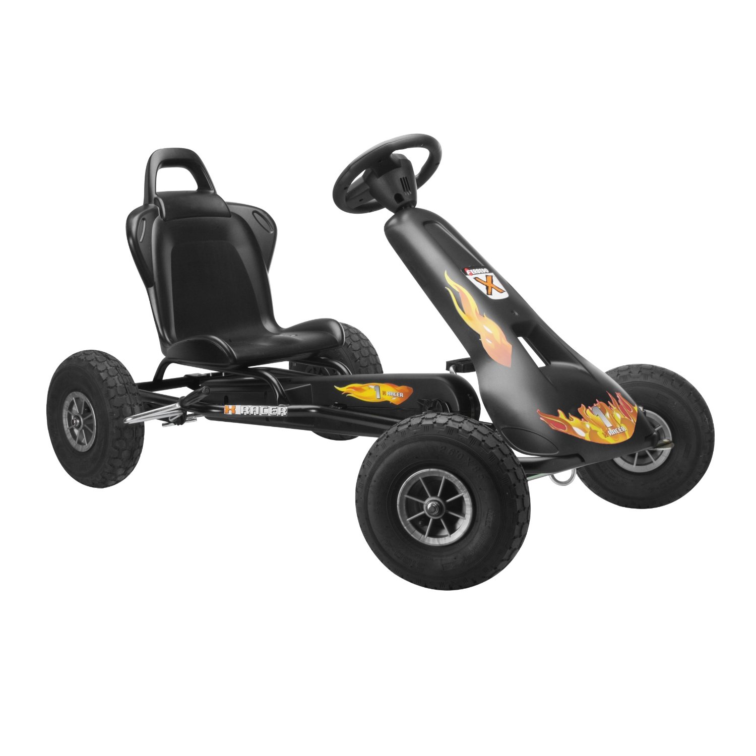 Für die einen ist der Air Racer der perfekte Go-Cart, wie er mehr Fahrspaß nicht bieten könnte: Das Soundlenkrad gibt Auskunft über Start, Hupen, Bremsen und Beschleunigen und findet beim Nachwuchs begeisterten Anklang. Der Freilauf sorgt dafür, dass bei einer schmissigen Fahrt bergab der Nachwuchs nicht stets in die Pedale treten muss, außerdem bürgt er beim Wechsel der Fahrtrichtung für ein hohes Maß an Sicherheit – immerhin können beide Hände am Lenkrad bleiben, weil Schalten überflüssig ist. Als Highlight darf durchaus auch das mitwachsende Konzept in Gestalt eines dreifach verstellbaren Schalensitzes gelten, außerdem will der Hersteller das häufige Problem springender Ketten durch eine integrierte Kettenspannung gelöst wissen. Die luftbereiften Räder bürgen für stets angenehme Fahrt auf Holperstrecken, für leichte Laufeigenschaften sowie leise Fahrgeräusche.Quietscht bei der Fahrt, Freilauf defekt