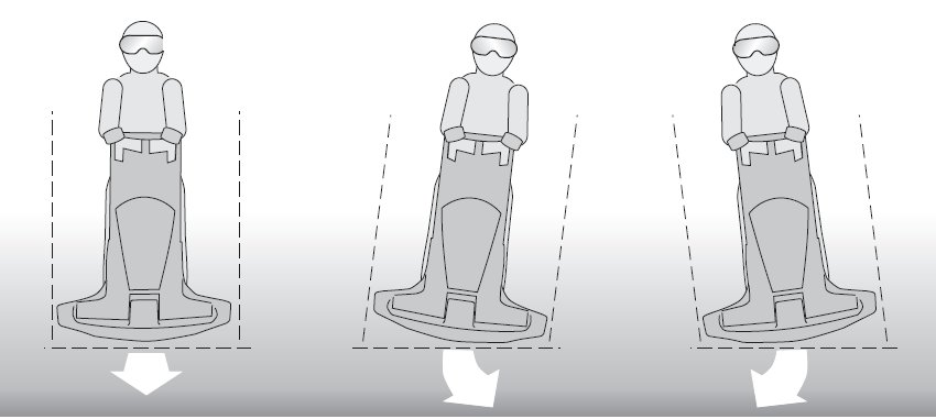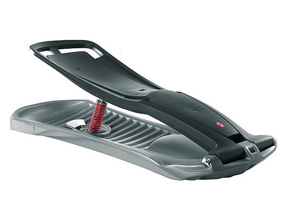 Letzteres trifft auf den Jetboard insofern zu, als die bevorzugte Fahrhaltung, wie bei seinem Pendant im Wassersport, im Stehen sein soll. Die Lenkung erfolgt dabei allein über eine Verlagerung des Gewichts, stabilisiert wird die Haltung durch den festen, beidhändigen Griff an der nach vorne aufklappbaren Kunststoff-Sitzplatte. Wird diese wieder umgeklappt, lässt sich mit dem Jetboard die Piste auch im Sitzen in Angriff nehmen. Eine Federung garantiert dabei einen relativ komfortablen Ritt den Hang hinunter, und zwar selbst auf buckligen Pisten.
