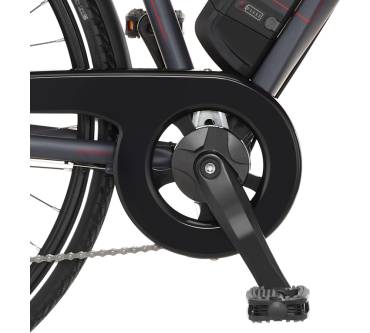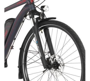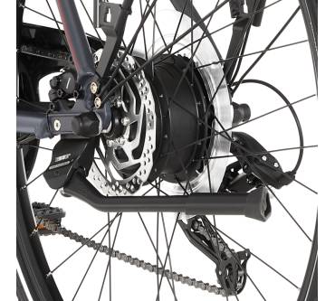 Tretunterstützung gibt es von einem Nabenmotor im Hinterrad. Auf Straßen und gut ausgebauten Waldwegen ist das kein Nachteil. Bei Überfahren von Bordsteinkanten, Schlaglöchern oder Wurzeln ist wegen des höheren Laufradgewichts Aufmerksamkeit geboten – Tretlagermotoren sind hier besser aufgestellt und stehen wegen des zentraleren Schwerpunkts auch beim Fahrhandling besser da. Zudem liefert der Motor im Vergleich zu den höheren Modellgeschwistern weniger Power.