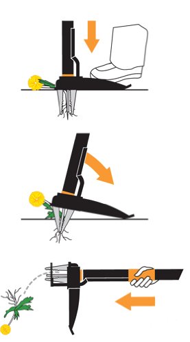 Genial einfach – der Fiskars muss lediglich senkrecht über dem Unkraut angesetzt werden, danach wird mit dem Fuß die Greifzange ausgefahren, die sich um die Wurzel schließt und diese fest packt. Anschließend macht sich der Fiskars die Hebelwirkung zunutze – er muss leicht nach hinten gekippt werden, und schon zieht er das Unkraut nebst Wurzeln sicher aus dem Boden heraus. Ein letztes, leichtes Ziehen am Griff, und der Fiskars lässt das Unkraut wieder fallen. Da das Gerät einen langen Stiel hat, kann die ganze Arbeit im Stehen stattfinden, lediglich Personen, die deutlich über 1,90 Meter groß sind, müssen sich leicht bücken – was wiederum jedoch kein Vergleich ist mit dem mühsamen händischen Ausstechen von Unkraut auf dem Boden kniend. Der simple Mechanismus erfordert außerdem nur einen geringen Kraftaufwand, das Gerät deckt daher die sprichwörtlich gewordene Zielgruppe „5-90 Jahren“ komplett ab und eignet sich auch bei lädierten Bandscheiben oder ähnlichen physischen Handicaps, die den Bewegungsspielraum sehr stark eingrenzen.