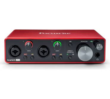 Das Scarlett 2i2 von Focusrite ist ein 2x2-kanaliges USB-Audiointerface mit einer größtmöglichen Auflösung von 192 kHz/24 Bit. Die zuschaltbare Air-Funktion der Mikrofon-Preamps verleiht dem Signal einen luftigeren, höhenbetonteren Charakter, was gut geeignet ist, um die Stimmen im Mix nach vorne zu bringen. Das Monitorsignal können Sie mit einem einfach zugänglichen Regler auf der Frontseite schnell auf mono schalten, was in vielen Situationen hilfreich ist, um einen schnellen Überblick über die Mischung zu bekommen.