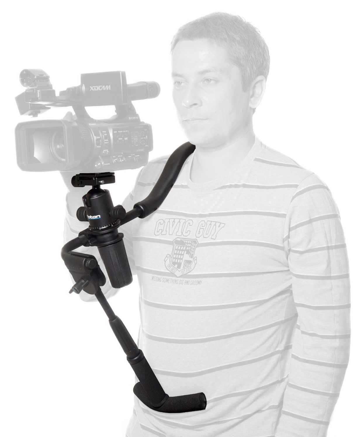 Das Stativ besteht aus einem großen gepolsterten Bügel, der über die Schulter gelegt wird und sich in die passende Form biegen lässt. Er ist verbunden mit einer Strebe, auf der ein Stativkopf mit Kugelgelenk angebracht ist. An dieser sitzt zudem eine zweite Stütze, die zum Bauch des Kameramanns führt und so für weiteren Halt sorgt. Die Bauchstütze lässt sich ausziehen und so in der Länge variieren und kann auch als zusätzlicher Handgriff genutzt werden. Da sie an ihrer Aufhängung sowohl seitlich als auch vor und zurück gedreht werden kann, ist die Bauchstütze exakt auf die jeweiligen Bedingungen anpasspar.Der auch in der Horizontalen drehbare Kugelkopf sorgt dann dafür, dass die Kamera exakt ausgerichtet werden kann. Ein großer drehbarer Griff dient zum justieren des Abstands zwischen Stativ-Kopf und Schulterbügel, außerdem lässt er sich als weiterer Handgriff nutzen.