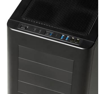 Mit einem Kampfgewicht von 13,8 Kilogramm und den Abmessungen 232 x 572 x 552 mm wird das Arc XL seinen Namen gerecht. Die Front wird von einem großen Mesh-Gitter mit Staubfilter bedeckt. Die darüber liegenden 5,25-Zoll-Laufwerksschächte vermitteln den Eindruck von Aluminium, sind aber nur aus Plastik. Das Frontpanel bietet jeweils zwei USB-2.0- und USB-3.0-Buchsen sowie Anschlüsse für ein Mikrofon und Headset. Mit dabei ist eine Lüftersteuerung mit klar definierten Stufen für fünf, sieben und zwölf Volt. Ein weiteres Mesh-Gitter bedeckt fast den gesamten Deckel und soll für einen verbesserten Airflow sorgen. Das linke Seitenteil wird von einem Sichtfenster aus Plexiglas dominiert. Die Unterseite ist mit einem entnehmbaren Staubfilter ausgerüstet, der neben dem Netzteil auch den daneben liegenden Lüfter abdeckt.