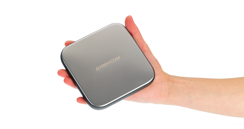 Das Gros der Festplatten auf dem Markt ist rechteckig, ein Format, an das sich die meisten Kunden intuitiv gewöhnt haben. Umso auffälliger ist daher das neue Modell aus dem Hause Freecom: Das 12 mal 12 Zentimeter große und 1,3 Zentimeter dicke Gehäuse fällt sofort in die Augen. Außerdem besteht es aus rostfreiem Edelstahl, der wiederum sandgestrahlt wurde, damit nicht jeder Fingerabdruck auf ihm zu sehen ist und auch kleine Kratzer und Beschädigungen, die sich mit der Zeit unweigerlich einstellen, eher unauffällig bleiben.
