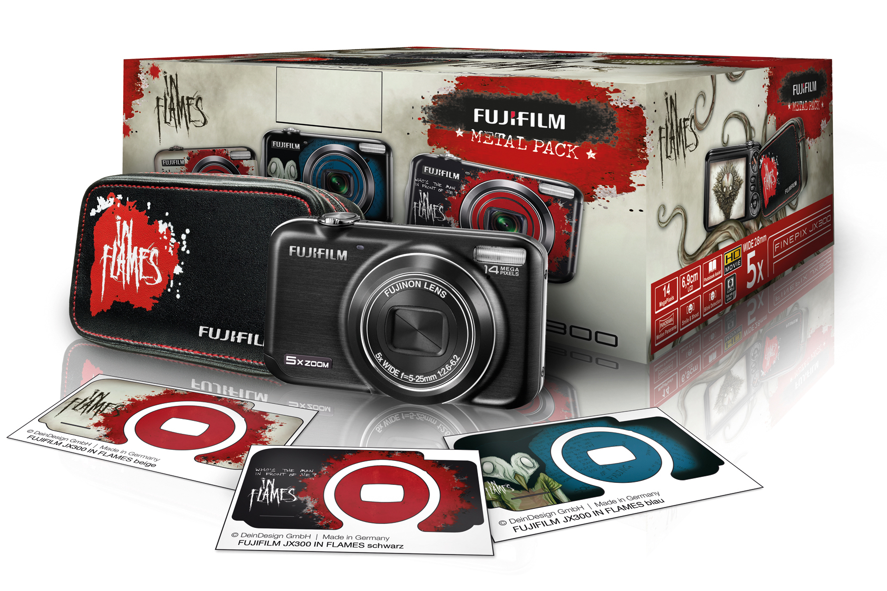 Die digitale Einsteigerkamera von Fujifilm wird jetzt auch als Sonderedition angeboten. Möchte man seine Kamera etwas aufhübschen, bietet der Hersteller das In Flames Metal Pack an, das neben einer Kameratasche auch drei Kamera-Skins im Lieferumfang hat. Die Kosten belaufen sich dann auf knapp 130 bei amazon – die einfache Version der JX300 ist dann deutlich günstiger und kann für rund 85 Euro bei amazon erworben werden.