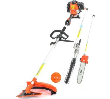 Das 4in1-Benzin-Multitool von Fuxtec ist nicht nur Motorsense und Rasentrimmer, es kann auch zur Heckenschere und zu einem Hochentaster umfunktioniert werden. Ausschlaggebend bei der Bemessung des leistungsstarken Motors war mit Sicherheit der Einsatz als Motorsense, da beim Trimmen von hohem Gras und kleinem Gestrüpp dem Gerät die meiste Leistung abverlangt wird.