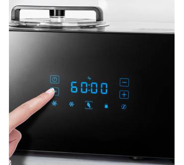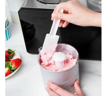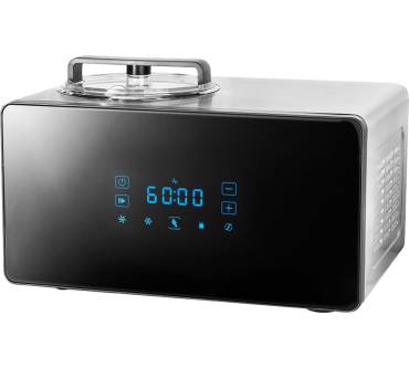 Die 2-in-1 Eismaschine und Joghurtbereiter eignet sich zur Herstellung von Eiscreme, Sorbet, Softeis oder (Frozen) Joghurt. Der Edelstahl-Eisbehälter ist spülmaschinengeeignet und bietet familientaugliche 1,5 Liter Fassungsvermögen. Dank integriertem Kühlkompressor ist das Gerät in wenigen Minuten auf -10 bis -30 Grad Celsius gekühlt. Über die Glasfront mit XL-Touchscreen ist die Bedienung besonders komfortabel. Sie können eines der Automatikprogramme, wie zum Beispiel das Joghurt-Programm für cremigen Naturjoghurt wählen. Die Eiskonsistenz ist auf soft, medium oder hart einstellbar und auch die Rührgeschwindigkeit können Sie individuell bestimmen. Je mehr Umdrehungen, desto mehr Luft wird unter das Eis geschlagen, was Nutzern zufolge cremige Resultate mit weniger Eiskristallen hervorbringt. Zusätzlich verfügt das Modell über eine Rührfunktion ohne Kühlen zum Anmischen von Zutaten, sowie über eine Kühlfunktion ohne Rühren für beispielsweise fertige Eismischungen. Der transparente Deckel mit Nachfüllkappe lässt das Ergänzen weiterer Zutaten zu. Mit unter 45 Dezibel ist das Betriebsgeräusch vergleichsweise leise. Die fertige Eiscreme behält dank automatische Nachkühlfunktion für zwei Stunden die gewählte Konsistenz.