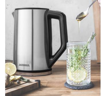 Der Gastroback Design Wasserkocher Cool Touch überzeugt durch sein doppelwandiges Edelstahl-Design, das für Sicherheit sorgt, indem es die Außentemperatur niedrig hält und Verbrennungen verhindert. Mit einem Fassungsvermögen von 1,5 Litern und einer Leistung von 2200 Watt erhitzt er Wasser schnell. Die Temperatur lässt sich in 14 Stufen von 35°C bis 100°C einstellen, wobei die genaue Wassertemperatur angezeigt wird. Eine automatische Warmhaltefunktion hält das Wasser für 30 Minuten auf der gewünschten Temperatur. Weitere Sicherheitsmerkmale umfassen eine Abschaltautomatik und einen Trockengehschutz. Der ergonomische Griff und der beleuchtete Ein-/Ausschalter erleichtern die Handhabung. Der Wasserkocher ist kabellos und verfügt über einen 360-Grad-Sockel, was die Nutzung flexibel gestaltet.