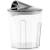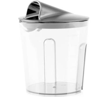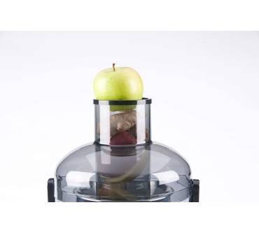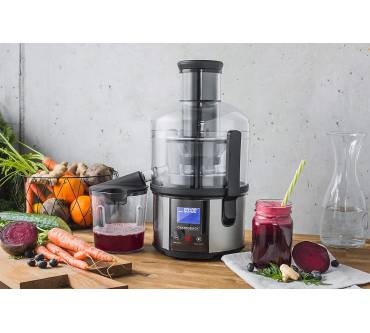 Dieser Zentrifugalentsafter von Gastroback kommt mit einem großen Einfüllschacht mit 85 Millimeter Durchmesser daher. Sogar ganze Äpfel passen hinein, größeres Pressgut müssen Sie nicht viel zerkleinern. Der Tresterbehälter ist im Gerät integriert, was Platz spart. Dennoch fasst er ordentliche 2 Liter, der Saftkrug selbst hat 1 Liter Volumen. Er ist mit einem Deckel und einer Mess-Skala versehen. Sie können 5 Geschwindigkeiten einstellen und am LCD-Display ablesen. Auch die Laufzeit wird angezeigt. Alle Anbauteile können Sie in den Geschirrspüler geben. Laut Nutzerberichten kleben an schmalen Stellen Obst- und Gemüsereste fest und können auch händisch nur schwer entfernt werden. Vereinzelt lösen sich außerdem im Betrieb die Verschlüsse, was zwar den Motor aus Sicherheitsgründen sofort stoppt, aber Zeit kostet.