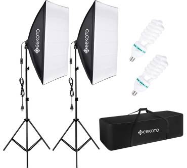 Der Lieferumfang des Geekoto Softbox-Set (DEA-SB02) ist für den geringen Preis beachtlich. Bis auf eine Kamera und ein Model ist eigentlich alles dabei, was ein Fotograf für die Porträtfotografie im Heimstudio benötigt. Nach der Lieferung müssen die Lampen nur noch an den Stativen befestigt und mit Strom versorgt werden und dann kann es eigentlich mit oder ohne Reflektoren und Diffusorplatten mit den Aufnahmen schon losgehen. Es kommen Energiesparlampen zum Einsatz, deren Farbtemperatur mit 5.500 Kelvin Tageslicht entspricht. Die Stative sind verstellbar. Die maximale Höhe beträgt zwei Meter. Das komplette Set kann für den Transport in einer kompakten Tasche verstaut werden und wiegt nicht viel.