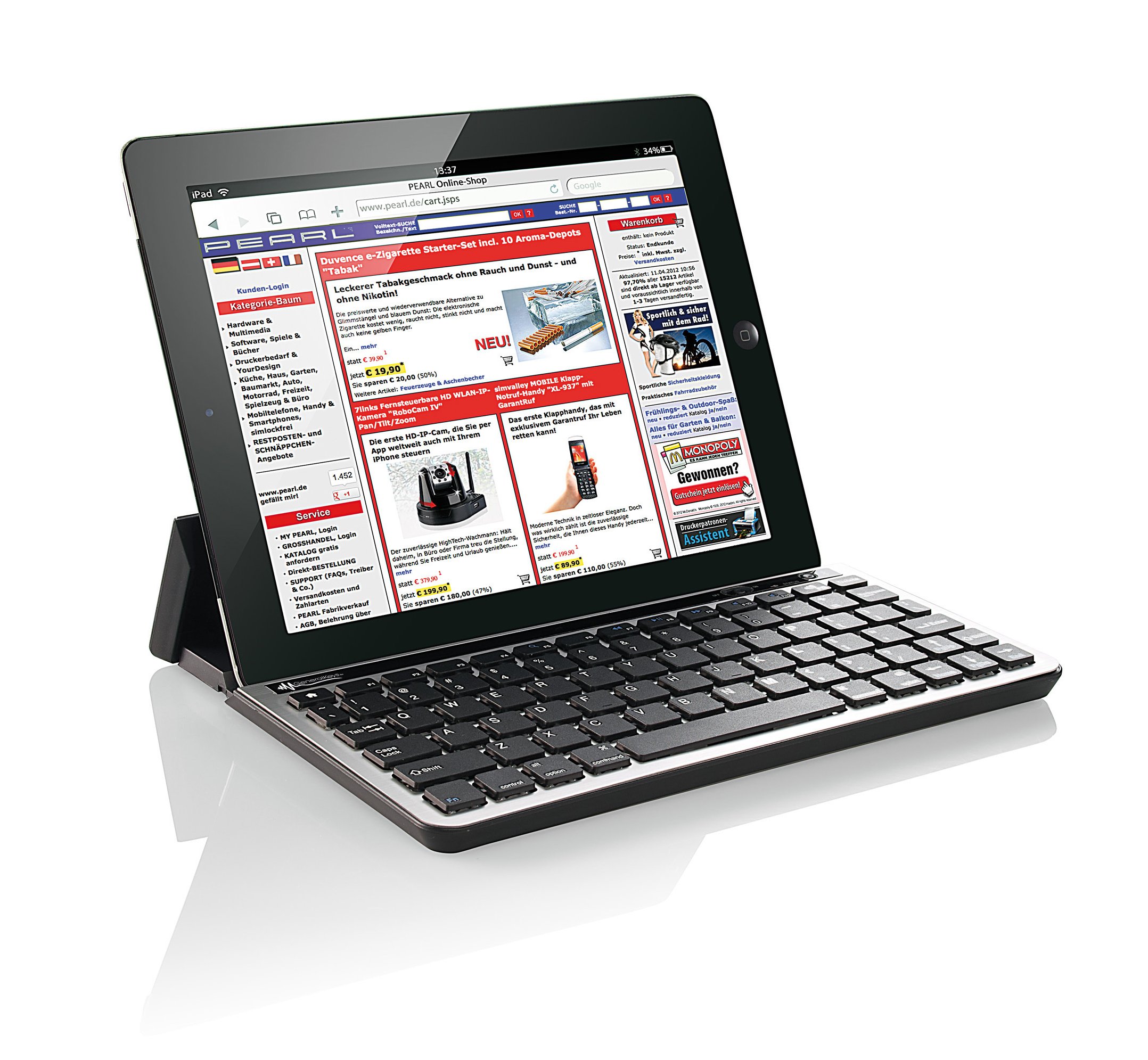 Der Boom der Tablet-PCs spült den Herstellern und Vertreibern von Zubehör derzeit mächtig Geld in die Kassen, Ständer, Sleeves und allem voran separate Tastaturen schießen wie Pilze aus dem Boden. Allen separaten Keyboards gemeinsam ist dabei die Anbindung via Bluetooth, zur Kommunikation mit dem mobilen PC ist also nicht einmal ein spezieller USB-Dongle, geschweige denn ein Kabel notwendig. Außerdem sind die meisten Tastaturen sehr klein, damit sie sich unkomplizierter transportieren lassen. Die General Keys etwa ist ebenfalls, voll im Trend liegend, nur 12 Millimeter hoch, als Standfläche nimmt sie knapp 25 mal 18 Zentimeter für sich in Anspruch – zumal mit dem Tablet-PC schöpft sie nicht einmal das auf einem Bistro-Tischchen in einem Café vorhandene Platzangebot aus. Die Verbindung über Bluetooth klappt in den meisten Fällen ebenfalls sofort auf Anhieb, die beiden Geräte erkennen sich schnell und schließen sich ohne Probleme kurz. Die Anschaffung eines solchen Zusatzgerätes lohnt sich vor allem für Vielschreiber, denn auf den sogenannten virtuellen Tastaturen der Tablet-PCs ist der Tippkomfort für längere Texte doch recht eingeschränkt. Die General Keys ähnelt im Outfit einer herkömmlichen Notebook-Tastatur – auch dies darf mittlerweile als Standard angesehen werden –, über ihren Tippkomfort wiederum liegen bislang noch keine Erfahrungsberichte vor. Mit Hilfe des integrierten Ständers kann der Tablet-PCs in eine optimale Schräglage zum Tippen, aber auch zum Surfen oder Videos schauen gebracht werden, und wer sie zu Hause an einen PC oder an ein Notebook ohne Bluetooth-schnittstelle verwenden will, benutzt dafür den beiliegenden USB-Bluetooth-Dongle. Auf dem Eingabegerät finden sich sogar alle Umlaute, Sondertasten besitzt die QWERTZ-Tastatur dafür nicht.