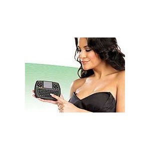 Die Sondertasten und Navigationselemente werden schließlich noch um eine vollwertige Tastatur ergänzt, lediglich ein separater Ziffernblock musste aus Raumgründen zum Opfer fallen. Die Mini-Maße ermöglichen es, die Tastatur wie einen Controller in beide Hände zu nehmen und zu bedienen, wobei keinerlei Kabel das Handling behindern – die Tastatur funkt die Befehle zum PC/Notebook. Mit Energie gespeist wird sie von zwei AA-Batterien.