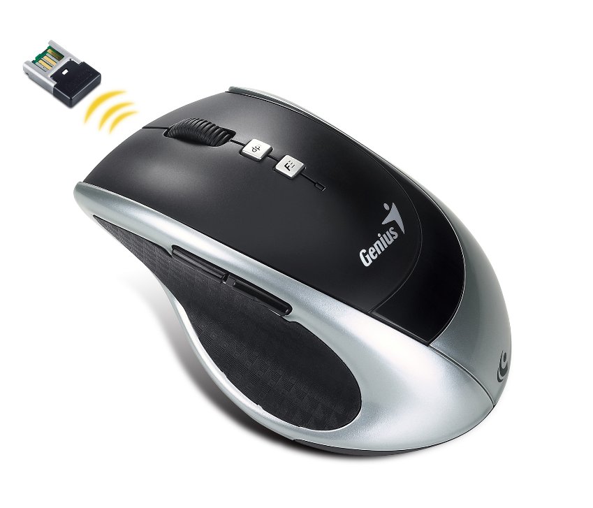 Die Maus ist aufgrund der Kondensatortechnologie auch sehr leicht, was wiederum nicht jedem Benutzer gefallen wird – das haptische Feedback spielt schließlich in etlichen Anwendungen doch eine nicht zu unterschätzende Rolle. Hinsichtlich der Sensor-Technologie wiederum setzt Genius auf einen optischen BlueEye-Sensor mit 1.600 dpi Auflösung, das heißt, die Maus ist als Eingabegerät für Standardanwendungen am PC oder Notebook gedacht und soll eine hohe Präzision bieten sowie auf nahezu allen Oberflächen einsatzbereit sein. Die Navigationsbefehle wiederum werden via bewährter 2,4-GHz-Funktechnologie an den Rechner weitergegeben. Die Maus besitzt ferner sieben Tasten, darunter die typischerweise an der Seite angebrachte Daumentasten für die Seitennavigation sowie ein dpi-Umschalter und eine Umschalttaste für das Scrollrad. Mit letzterer lässt sich ein Schnellscrollmodus aktivieren. Gummiflächen an der Seite, ebenfalls immer häufiger Teil der Standardausstattung neuer Mäuse, stellen genügend Grip in Aussicht, falls es einmal brenzliger zugeht oder höchste Konzentration gefragt ist.