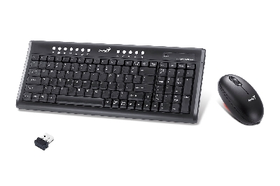 Das Desktop-Set kommuniziert über die 2,4-GHz-Funktechnologie, die sich im Bereich der PC-/Notebookperipherie als unkomplizierte und nahezu störungsunanfällige Verbindung bewährt hat. Ein entsprechender Mini-Empfangsdongle für die USB-Schnittstelle liegt dem Set natürlich bei. Technisch wiederum bietet die Genius solide Kost, wie vom Hersteller gewohnt. Das Keyboard besteht sogar nicht nur aus einem herkömmlichen Standard-Tastenset, sondern verfügt darüber hinaus über 12 Sondertasten, über die sich Mediaplayer steuern sowie E-mail- und Internetprogramme sowie Windows-Funktionen schnell und unkompliziert aufrufen lassen.