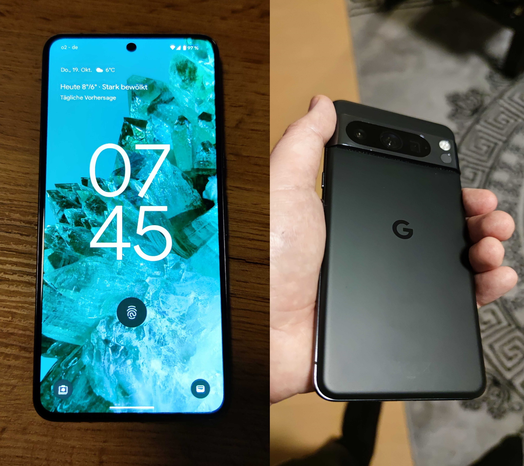 Auf den ersten Blick ähneln das Google Pixel 8 Pro und auch das kompaktere Schwestermodell Pixel 8 der Vorgängergeneration. Die Designästhetik mit dem sehr weit abstehenden Kamera-Balken ist natürlich Geschmackssache, aber ein Vorteil ist eindeutig, dass das Gerät nicht kippelt, wenn man es liegend bedient, während die Kamera-Flatschen von iPhone 15 und Co. für ein gewisses Ungleichgewicht sorgen. Die Ecken wurden abgerundet, was für ein handschmeichelndes Gefühl sorgt. Zudem ist das Display nicht mehr zum Rand hin gekrümmt und stattdessen flach, was ein Segen für die Bedienbarkeit ist.Das Pixel 8 Pro setzt auf eine mattierte Glasrückseite, die sich sehr gut anfässt, aber weniger griffig ist als man denkt. Das Kameramodul und die Ränder sind aus Hochglanz-Aluminium, das etwas anfällig für Kratzer zu sein scheint. Neben der von mir erwählten Farbe Obsidian Black gibt es dieses Jahr auch noch elegantes Porzellan und den knallig-hellblauen Farbton Bay.