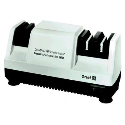 Das wichtigste Werkzeug eines Kochs sind seine Messer. Damit die immer schön scharf sind, können sie mit dem CC-100 Diamant-Messerschärfer von Graef geschliffen werden. Und das, ohne Kraftaufwand, denn der Graef schärft die Messer elektrisch. Die Messer werden in 3 Phasen geschliffen. Zuerst wird grob vorgeschliffen, dann fein nachgeschliffen und dann abgezogen, das bedeutet, die Klinge wird an Magneten entlanggezogen, um die Elementarteilchen im Metall auszurichten. Mit dem Gerät soll der Materialabrieb minimal gehalten werden, so dass Messer eine längere Lebensdauer erhalten. Trotzdem muss - wie bei allen elektrischen Schärfern – darauf geachtet werden, dass das Messer schnell durch das Gerät gezogen werden. Sonst wird zu viel vom Messer abgeschliffen.