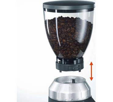 Zwiespältig hingegen fallen die Reaktionen auf den Bohnenbehälter aus. Mit einem Fassungsvermögen von 350 Gramm ist er fast riesig und dominiert dementsprechend auch das Erscheinungsbild der Kaffeemühle. Nicht jeder zeigt sich darüber begeistert. Da jedoch die Behälter der älteren Maschinen sich ebenfalls aufsetzen lassen, können zumindest Besitzer der Vorgängerin diese kleine Schwachstelle elegant umgehen.