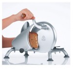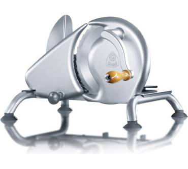 Viele Kunden, die sich eigentlich nur eine Brotschneidemaschine zulegen wollten und daher ein Gerät mit Handbetrieb ausgewählt haben, waren überrascht, dass sich mit dem Graef auch jedes andere Schnittgut fast problemlos schneiden ließ. Denn das Messer des Allesschneiders soll superscharf sein, so dass sich sogar der Kraftaufwand sehr in Grenzen hält. Die fest montierte Kurbel würde es allerdings sogar erlauben, dass mit ordentlich Wumms an ihr gedreht wird. Das Messer sei sogar dazu in der Lage, hauchdünne Scheiben von Schinken abzuschneiden, eine Aufgabe, an der so manches elektrische Modell auf dem Prüfstand schon gescheitert ist. Der händische Betrieb kann mitunter sogar von Vorteil sein. Die Drehgeschwindigkeit des Messers lässt sich nämlich fast nach Belieben verlangsamen, was das Schneiden von besonders weichen Lebensmitteln erleichtert. Paradox: Ausgerechnet beim Brotschneiden musste der Graef schon Kritik einstecken. Auf den letzten Millimetern wird nämlich manchmal die Scheibe nicht mehr durchgeschnitten, so das sich ein Abriss ergibt. Mit diesem Problem haben allerdings viele Allesschneider, ob elektrisch oder manuell, zu kämpfen. Erfahrungsgemäß lässt es sich mit etwas Übung in den Griff bekommen. Der große Abstand zum Boden wiederum hat den Vorteil, dass unter das Messer jede x-beliebige Servierschüssel oder -Platte untergebracht werden kann, auch Modelle mit einem hohen Rand. Ein Daumenschutz sowie ein Schnittbreitenregler (0 bis 15 Millimeter, also Standard) runden das Paket ab.