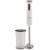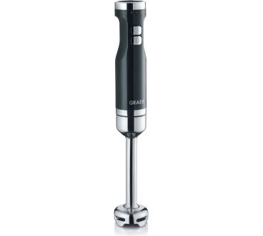 Der Stabmixer HB 502 schafft mit seinem 800-Watt-Motor und auf höchster Stufe mit 13.000 Umdrehungen auch harte Lebensmittel und mixt, püriert und shaked mit verschiedenen Aufsätzen Speisen aller Art: Zusätzlich zum Mixaufsatz, der vollständig aus Edelstahl besteht, legt Graef einen Rührbesen, einen Zerkleiner und einen Kunststoffbecher bei. Die spezielle Form des Mixaufsatzes verhindert Spritzer und der Stabmixer liegt Tests zufolge gut und sicher in der Hand. Auch die Verarbeitung sei einwandfrei und robust. Dank des geringen Gewichts von 1,47 Kilogramm ist ein ermüdungsfreies Arbeiten möglich. Insgesamt zeigt sich das Modell mit sehr guten Eigenschaften, für die der Preis von rund 74 Euro nicht zu hoch ist.