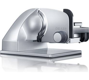 Der Schlitten des Graef weist gleich zwei ungewöhnliche Ausstattungsmerkmale aus. Zum einen nämlich ist an seiner Unterseite die Kindersicherung angebracht, die verhindert, dass sich das Gerät in Betrieb nehmen lässt. Weiterer Vorteil: Zum Schneiden selbst müssen nicht, wie bei vielen Konkurrenzmodellen, bei denen die (Kinder-) Sicherung in einer zusätzlichen Sicherheitstaste besteht, zwei Tasten gleichzeitig gedrückt gehalten werden. In der Praxis kann sich diese Methode nämlich als recht unkomfortabel entpuppen. Beim Graef dagegen muss nur ein Schalter gedrückt werden, der sich – und darin liegt das zweite spezielle Merkmal – direkt am Schlitten befindet. Der Allesschneider lässt sich daher sehr bequem mit einer Hand führen und bedienen, ein Punkt, der schon viele Kunden regelrecht begeistert hat. In puncto Handhabung gehört der Graef mit Sicherheit zu den attraktivsten Modellen am Markt.