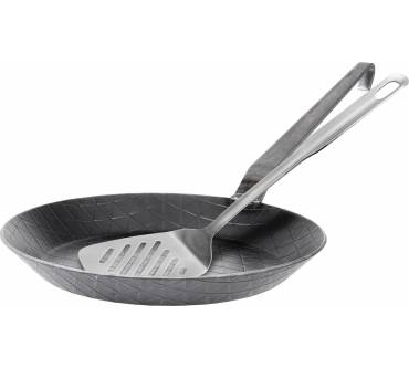 „Plus: einfache Verwendung v. a. dank geringen Gewichts; heizt schnell auf; lässt sich gut ausgießen; Pfannenwender im Lieferumfang.