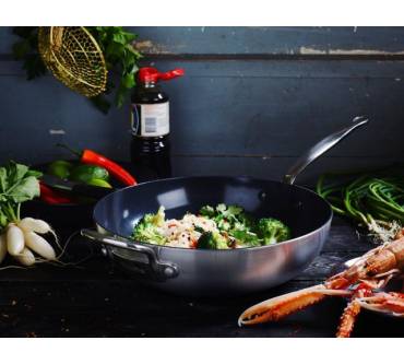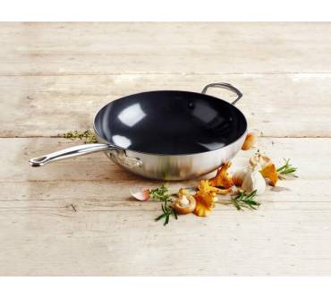 Mit dem GreenPan Barcelona Evershine Wok zieht durchdachte Kochgeschirr-Technologie in Ihre heimische Küche ein. Knapp 1,9 Kilogramm bringt das Schwergewicht auf die Waage und zählt damit nicht unbedingt zu den leichtesten Vertretern seiner Art. Dafür heizt sich der Pfannenboden allerdings innerhalb kürzester Zeit auf und hält die Hitze anschließend auch gut. Scharfes Anbraten, wie in der asiatischen Küche üblich, ist demnach kein Problem. Dass Zutaten anbacken könnten, brauchen Sie dabei dank der keramischen Beschichtung mit Diamantverstärkung nicht zu befürchten. Sie hält Temperaturen bis 300 Grad Celsius mühelos aus und lässt sich im Anschluss ans Kochvergnügen auch angenehm leicht säubern. Zudem verspricht das Evershine-Finish langanhaltenden Glanz ohne Verfärbungen durch Curry und Co. Das ETM-Testmagazin 2/2019 adelt dieses Können mit dem Urteil "Gut".