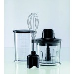 Möglich macht dies das Zubehör, unter dem an erster Stelle der zusätzliche Schneebesen genannt werden muss. Denn wie in zahlreichen Kundenrezensionen und Artikeln in Fachmagazinen nachgelesen werden kann, ist ein Stabmixer meist überfordert, wenn es um die Herstellung von steifer Sahne oder Eischnee geht. Wie der eigentliche Mixfuß, besteht auch der Schneebesen größtenteils aus Edelstahl. Des Weiteren findet sich im Lieferumgang des Grundig auch noch ein separater Universalzerkleinerer. Diese Geräte sind praktisch, wenn etwa kleinere Mengen an Lebensmitteln oder Kochzutaten wie Nüsse oder Gewürze zubereitet werden sollen, außerdem eignen sie sich meist hervorragend für Pesto, Mayonnaise, Saucen oder Dips. Eine Anti-Rutschauflage verhindert, dass der Universalzerkleinerer sich selbständig machen kann, was auch auf den Messbecher zutrifft, der zudem mit einem Deckel verschlossen und als Frischhaltebox eingesetzt werden kann.