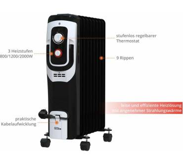 Der Elektroheizkörper von Güde gehört zu den klassischen Ölradiatoren, die nach dem Prinzip der Konvektion für angenehme Temperaturen in der Übergangszeit und bei Gelegenheitseinsätzen sorgen. Das Leistungsniveau wählen Sie in drei Stufen zwischen 800 und 2.000 Watt. Die angestrebte Zieltemperatur regulieren Sie über den integrierten Thermostat stufenlos. Für Sicherheit während des Betriebs sorgen ein Kipp- und ein Überhitzungsschutz. Wird der Heizkörper gerade nicht benötigt, verstauen Sie das Elektrokabel in der dafür vorgesehenen Aufwicklung. Das Bewegen des Güde gestaltet sich einfach, er ist mit vier lenkbaren Transportrollen und einem einklappbaren Bügel ausgestattet. Mit einem Lärmwert von 30 Dezibel macht sich das Standgerät akustisch kaum bemerkbar.
