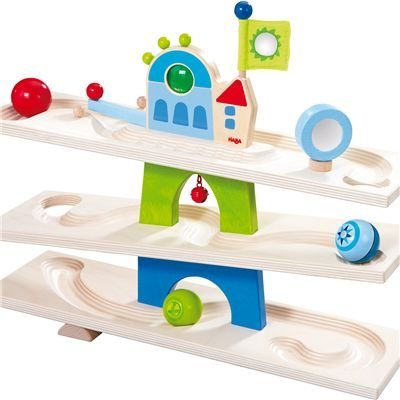 Bei der Klick-Klack hat man es mit einer Holzkugelbahn für Kinder ab drei Jahren zu tun, die aus unbehandeltem Birkenholz gefertigt ist. Die Ausstattung umfasst neben dem Hauptgestell in der Größe von 50 x 40 x 16 Zentimeter ein Prisma, einen Spiegeldruck nebst Glöckchen sowie drei große Holzkugeln. Bei Letzteren setzt Haba auf die gewohnte gestalterische Abwechslung: Die Kugeln sind zum Teil mit Durchsicht gearbeitet, farbig lackiert oder mit einer Rasselfunktion ausgestattet. Daneben soll sich die Bahn auch für die Haba-Entdeckerkugeln eignen, die allerdings nicht im Lieferumfang enthalten sind.Pädagogischer Spielwert