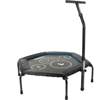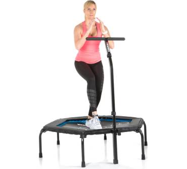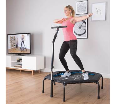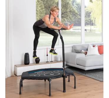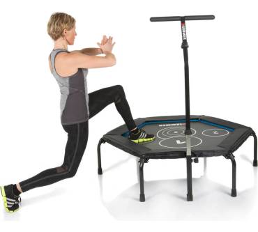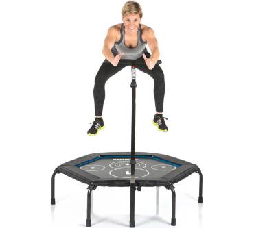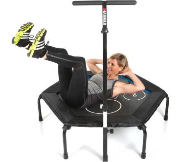 Mit dem Cross Jump von Hammer steigern Personen bis zu einem Körpergewicht von 130 Kilogramm bei viel Spaß ihre Ausdauer und Fitness. Das Springen auf so einem Gerät bringt nämlich das Herz-Kreislauf-System ordentlich in Schwung. Damit es dabei nicht zu Verletzungen kommt, ist das Trampolin mit stabilen Stützfüßen versehen, die durch Schutzkappen aus rutschfestem Material einen guten Stand gewährleisten. Außerdem verhindert die verstellbare Haltestange ein versehentliches Abrutschen von der Sprungfläche. Die korrekte Abfolge von Übungen, die zum Beispiel in einem Online-Trainingsvideo von Hammer angeschaut werden können, wird durch vier Markierungen erleichtert.
