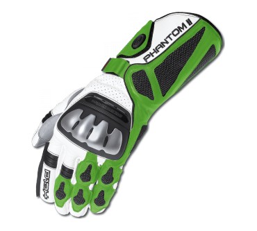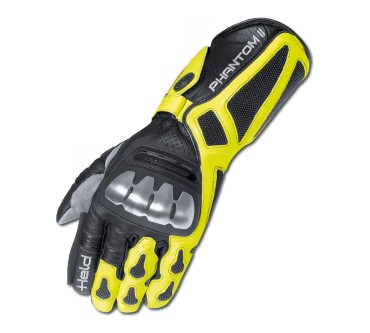 Der Held Phantom II ist ein hochwertiger Sportmotorradhandschuh, gefertigt aus leichtem, hochabriebfestem Känguruleder, das für seine Langlebigkeit und Schutzwirkung bekannt ist. Die Oberhand ist vollständig mit DuPont™ Kevlar® unterlegt, was zusätzliche Sicherheit bietet. Für den Schutz der Handrücken sorgt ein stoßabsorbierender Suprotect®-Spezialschaum, während die Knöchel durch eine Titan-Knöchelschale geschützt sind. Die Handfläche ist mit hochabriebfester Rochenhaut verstärkt, die für ihre extreme Abriebfestigkeit und Haltbarkeit geschätzt wird. Für zusätzlichen Komfort verfügt der Handschuh über einen Visierwischer am linken Zeigefinger, der das Reinigen des Helms während der Fahrt erleichtert. Die Innenhand ist vorgekrümmt und faltenfrei gearbeitet, was für ein optimales Gefühl am Lenker sorgt. Zudem ist der Handschuh perforiert, um die Belüftung zu verbessern und die Hände kühl zu halten. Der Tunnel-Handgelenkriegel und der Klettverschluss an der Stulpe sorgen für einen sicheren Sitz. Der Held Phantom II ist in verschiedenen Größen und Farbvarianten erhältlich und bietet somit für viele Fahrer eine passende Option. Zertifiziert nach der Norm EN 13594:2015 erfüllt er die Sicherheitsstandards für Motorradhandschuhe.