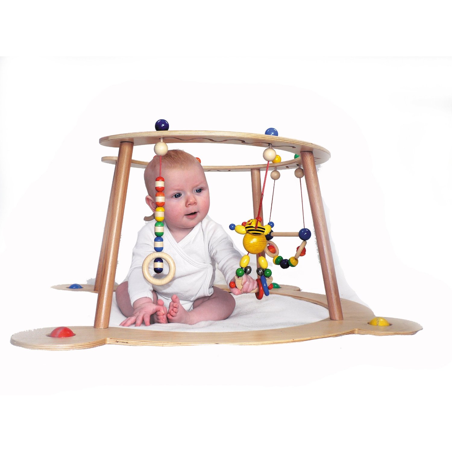 Wer sich auf dem Markt der Babyspielzeuge umsieht, stößt meist auf multifunktionale Gerätschaften aus Kunststoff, die mit Farben, Licht, Akustik und Massagefunktion aufwarten können und Babys in einer passiven Körperhaltung zwingen. Anders bei diesem Modell: Der renommierte Hersteller Hess-Spielzeug verzichtet ganz bewusst auf elektronischen Thrill und setzt stattdessen auf warmes Holz, angenehme Farben und runde Formen. Das Gerät eignet sich für erste motorische Erfolgserlebnisse, regt Babys zum Greifen, Sehen und Hören an und motiviert sie dazu, sich aus eigener Kraft zur Seite und auf den Bauch oder Rücken zu drehen. Dank seiner halbrunden Form und der drei Rollen können Babys darin auch die ersten gefahrlosen Gehversuche unternehmen. Nach Kundenmeinung scheint es sich bei diesem Kandidaten um ein Vorzeigemodell von überragendem Nutzwert für die motorische und auditive Entwicklung zu handeln, das - im Gegensatz etwa zu den elektronischen Kollegen mit Schaukelfunktion - dem Baby Anreiz gibt, sich aus eigener Anstrengung in eine andere Lage zu bringen.Sauber geschliffene Kanten, versenkte Schrauben, perfekt.
