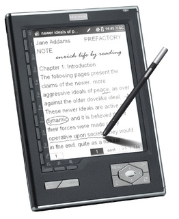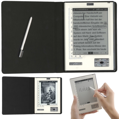 „Stiftbedienung. Touchscreen mit Eingabestift, Bild gut bei mittlerem, schwach bei dunklem und sehr hellem Umgebungslicht. Zahlentasten neben dem Schirm. Handschriftliche Textkommentare. Langsam beim Öffnen und Blättern. Akku hält über 14 Tage. Spielt MP3. Menü nach Software-Aktualisierung teilweise in englisch.“