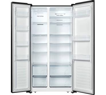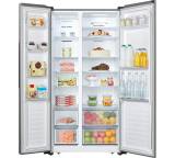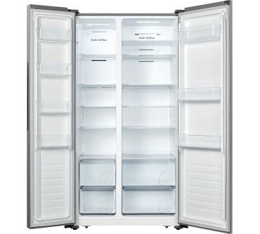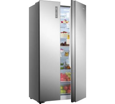 Die Side-by-Side-Gefrierkombination von Hisense ist mit einem nutzbaren Gesamtvolumen von 519 Liter für Haushalte interessant, in denen regelmäßig größere Mengen Kühl- und Gefriergut aufbewahrt werden. Der Kühlbereich bietet Ihnen Platz auf fünf Einlegeböden aus Glas, in drei Türfächern sowie in zwei transparenten Schubladen für Obst und Gemüse. Sowohl im Kühl- als auch in Gefrierteil sorgt eine Umluftkühlung für die gleichmäßige Verteilung der Kälte. Das Gefrierteil ist mit einem No-Frost-System ausgestattet, das die energiefressende Bildung von Eis vermeidet und Ihnen das turnusmäßige Abtauen abnimmt. Die Temperaturen zum Kühlen und Gefrieren regulieren Sie jeweils separat über ein außenliegendes Touch-Panel. Die Türen bleiben dabei geschlossen, Kälteenergie geht nicht verloren. Das Gefriertvermögen von 8,5 Kilogramm pro Tag ist für die Bedürfnisse der meisten Haushalte ausreichend. Die Überbrückung von Stromunterbrechungen fällt mit 8 Stunden allenfalls durchschnittlich aus. Mit einem Lärmwert von 35 Dezibel hält sich der Hisense akustisch dezent im Hintergrund. Bei der Farbe haben Sie die Wahl zwischen Schwarz und Edelstahl-Optik.