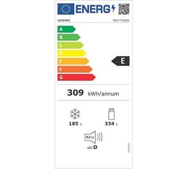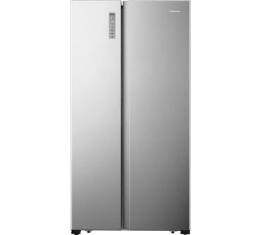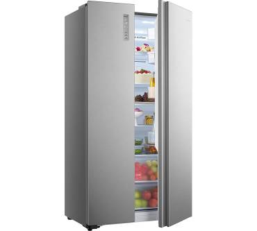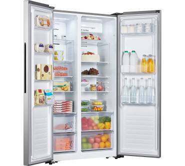 Der Side-by-Side-Kühlschrank von Hisense ist mit einem nutzbaren Gesamtvolumen von 520 Liter auf die Bedürfnisse größerer Haushalte ausgelegt. Sowohl im Kühl- als auch im Gefrierteil sorgt ein Umluftsystem für die gleichmäßige Verteilung der Kälte. Jeweils zwei der fünf Einlegeböden im Kühl- und im Gefrierteil lassen sich in der Höhe verstellen. In beiden Einheiten des Side-by-Side-Kühlschranks sorgt eine LED-Beleuchtung für den Überblick über Ihre Vorräte. Im Gefrierteil verhindert ein No-Frost-System die Bildung von Eis. Die gewünschten Temperatureinstellungen nehmen Sie über ein außenliegendes Bedienfeld vor, eine der Türen muss dazu nicht geöffnet werden. Vergessen Sie einmal das Schließen einer Tür, meldet sich der Hisense mit einem akustischen Alarm. Während die Gefrierleistung mit 11 Kilogramm pro Tag der Gerätegröße angemessen ist, bleibt die Überbrückung von Stromausfällen mit 8 Stunden hinter dem Durchschnitt dieser Produktkategorie zurück.