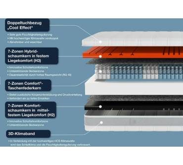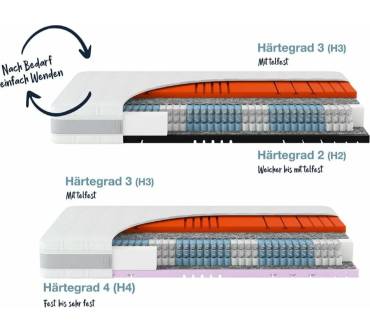 Der Hersteller Hn8 Schlafsysteme stellt mit der Matratze Sleep Balance TFK ein Modell mit einem Kern aus Gel- und Kaltschaum vor. Die Kombination verspricht eine hohe Druckentlastung und Anpassungsfähigkeit. Gelschaum schmiegt sich sehr exakt an Ihre Körperformen an, erfordert dafür allerdings, anders als Viscoschaum, keine Wärmeentwicklung. Die Unterlage eignet sich aufgrund dieser Eigenschaften gut für Personen mit Rückenproblemen, die Wert auf eine maximale Entlastung legen. Ein Pluspunkt für Menschen mit Allergie: Das Material lässt Milben und Co. keine Chance, sich anzusiedeln. Zu einem hygienischen Schlafgefühl trägt der bei 60 Grad waschbare Bezug bei. Dank Vier-Wege-Reißverschluss lässt dieser sich einfach abziehen. Sie wählen zwischen zwei Versionen, die Sie durch Wenden in jeweils zwei Härtegraden nutzen können: H2 und H3 sowie H3 und H4. Das Raumgewicht lässt mit 30 Kilogramm pro Quadratmeter in Härtegrad 2 und 40 Kilogramm in den weiteren Härtegraden auf eine Haltbarkeit von durchschnittlich drei bis fünf Jahren schließen. Der Preis beginnt aktuell bei 179 Euro, was für die insgesamt erfreulichen Eigenschaften fair ist.