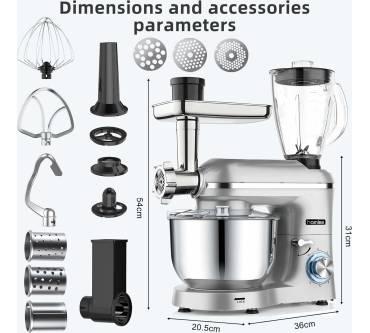Die Homlee 3 in 1 Küchenmaschine ist ein multifunktionales Gerät mit einem 1800-Watt-Motor und einer 5,5-Liter-Edelstahlschüssel. Sie bietet sechs Geschwindigkeitsstufen und eine Pulsfunktion. Zusätzlich verfügt sie über einen Fleischwolf, eine 1,5-Liter-Saftpresse und verschiedene Rührwerkzeuge. Das Gehäuse besteht aus Edelstahl, und die Maschine wiegt 9,5 Kilogramm. Sie ist 36 cm tief, 31 cm hoch und 20 cm breit.