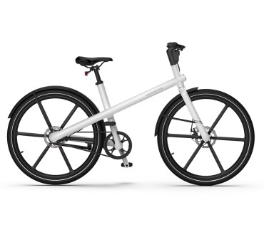 Mit dem Uni 4 verfolgt Honbike ein ganz ungewöhnliches Rahmenkonzept: Ein einzelnes Aluminiumrohr verbindet das Steuerrohr mit dem Hinterrad und führt rechtsseitig am Sitzrohr vorbei. Eine einseitig links geführte Kettenstrebe vervollständigt den Rahmen. Dieses Design hat in erster Linie einen funktionellen Wert: So kann ein Antriebsriemen verpflanzt werden, ohne die rechte Kettenstrebe aufsägen zu müssen. Der Motor befindet sich im Hinterrad und der für ein Leichtpedelec durchaus stattliche, rund 430 Wh große Akku im Rahmen. Mit etwa 20 kg ist das Bike angenehm leicht und kann auch noch über ein paar Etagen in die Wohnung getragen werden. Das wird auch nötig sein, weil der Akku nicht entnommen werden kann und das komplette Rad zum Laden an die Steckdose will. Leider erwies sich die Anzeige des Akkustands im Test von c’t als ziemlich unzuverlässig. Die Unterstützung wird in drei Stufen abgerufen, und das unabhängig vom Pedaldruck. Um voranzukommen, reicht also auch schon der bloße Pedaltritt – die großen Markenaggregate sind da dynamischer. Zudem erweist sich der Motor als eher schwachbrüstig. Auf eine Gangschaltung wird verzichtet und die Übersetzung fällt recht kurz aus. Heißt: Das Rad ist beim Anfahren schnell auf Zack. Will man aber richtig Tempo machen, ist schnelles Strampeln angesagt. An anderen Stellen erfordert das Uni 4 ebenfalls Kompromissbereitschaft, etwa bei den mechanischen Scheibenbremsen. Darüber hinaus ist viel Plastik verbaut. Schutzbleche und ein Ständer sind im Lieferumfang enthalten. Laut Hersteller entsprechen die Antriebsteile der Schutzklasse IPX6. Das bedeutet, dass es sogar kurzzeitig unter Wasser getaucht werden kann.