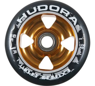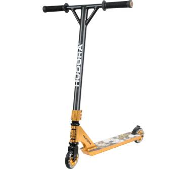 Mit der XR-Reihe will Hudora jetzt auch den Markt der Stunt-Scooter kräftig aufmischen. Für nicht einmal 100 Euro findet sich im Sortiment ein augenscheinlich vollwertiges Exemplar für den Skatepark. Der Hersteller wirbt mit qualitätsversprechenden Merkmalen wie Markensteuersatz, ABEC-7-Lagern und „hochwertigem“ Aluminium und zielt ausdrücklich auf den Einsatz in Halfpipes oder auf Rampen ab. Für längere Strecken eignet sich diese Art von Rollern jedoch kaum, denn die kleinen und recht harten Rollen (hier: Härtegrad 88 A) weisen Fahrern vor allem bei Unebenheiten die Schranken.