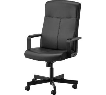 Das Polster besteht aus Kunstleder, was mit der Zeit eine schwitzige Sache werden kann. Häufig verschleißt Kunstleder außerdem schnell. Auf der Haben-Seite des Drehstuhls stehen das angenehme Design sowie die einfache Bedienung: Der Knopf für den Rückenlehnengegendruck sowie der Hebel für die Höhenverstellung befinden sich leicht erreichbar an der Unterseite. Ikea stattet den Drehstuhl zudem standardmäßig mit Armlehnen aus – das ist nicht immer selbstverständlich. Angesichts des Preises dürfen Sie hier keine hohe Qualität erwarten. Rund 70 Euro werden fällig.