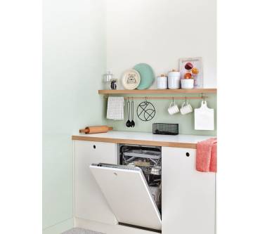 Die 45 Zentimeter breite Geschirrspülmaschine DSIO 3T224 CE von Indesit bietet Platz für zehn Maßgedecke. Angesichts der kompakten Maße ist das großzügig. Sperrige Töpfe dürften Sie dank des höhenverstellbaren Oberkorbs ebenfalls unterbringen. Interessant für Eltern ist zum einen das Baby-Programm, das Bakterien nahezu vollständig eliminieren soll. Zudem können Sie ein spezielles Fach für Babyflaschen und Co. nutzen. Angenehm für die ganze Familie ist die geringe Geräuschentwicklung von 44 Dezibel. Die Maschine ist damit kaum hörbar. Erfreulich sind schließlich die ressourcenfreundlichen Verbrauchswerte: Obwohl die Maschine „nur“ mit Energieeffizienzklasse A++ ausgezeichnet ist (der zweitsparsamste Wert), benötigt sie lediglich 212 kWh im Jahr und rund 2.500 Liter Wasser. Dass Sie nur rund 370 Euro zahlen, ist ein weiterer Pluspunkt.