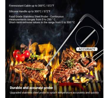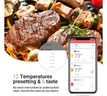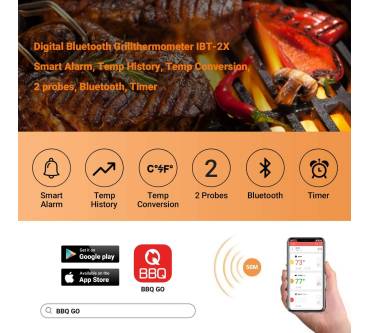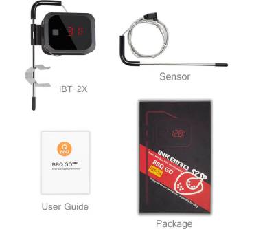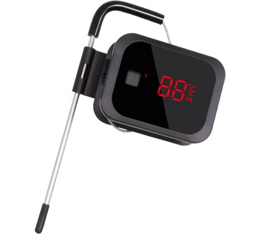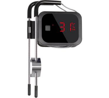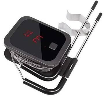 Das Grillthermometer von Inkbird ist mit zwei unabhängig voneinander messenden Temperaturfühlern ausgestattet. Sie können damit Lebensmitteltemperaturen bis zu 250 Grad Celsius, kurzzeitig sogar 300 Grad Celsius, messen. Angezeigt wird die aktuelle Temperatur über ein Display am Gerät, eine Verbindung mit dem Smartphone via Bluetooth ist ebenfalls möglich. Die drahtlose Verbindung soll Distanzen von bis zu 50 Meter überbrücken. Sie können einen Zielwert für die Temperatur angeben, bei deren Erreichen sich das Inkbird mit einem Alarmton meldet. Eine Timer-Funktion steht ebenfalls zur Verfügung. Sie haben darüber hinaus die Möglichkeit, den Temperaturverlauf über den gesamten Garprozess hinweg aufzuzeichnen. Der Rand des IBT-2X ist so gestaltet, dass Sie die Kabel der Temperaturfühler aufwickeln können.