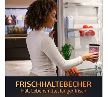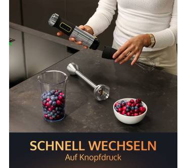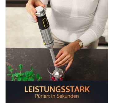 Der kompakte und kraftvolle Stabmixer ermöglicht das schnelle und einfache Mixen und Pürieren von beispielsweise Smoothies, Suppen, Dips und Babynahrung. Zur Ausstattung gehört ein 800 Milliliter Mix- und Messbecher mit Deckel, in dem Sie Ihre Zubereitungen mixen und aufbewahren können. Der solide XL-Edelstahlmixfuß lässt sich per Knopfdruck anbringen und besticht durch seine besonders scharfen und widerstandsfähigen Titanklingen. Diese ermöglichen das mühelose Mixen von selbst härtesten Zutaten, wie Anwender berichten. Für präzise Anpassung der starken 1.500 Watt Leistung haben Sie eine breite Spanne an 21 Geschwindigkeitsstufen zur Verfügung. Darüber hinaus gibt es eine extrastarke Pulsfunktion. Mixergebnisse gelingen zügig und gleichmäßig, wie Rezensenten berichten. Das Betriebsgeräusch fällt einigen Nutzern zufolge vergleichsweise laut aus. Die Reinigung ist leicht zu bewältigen, Messbecher und Deckel sind zudem spülmaschinengeeignet.