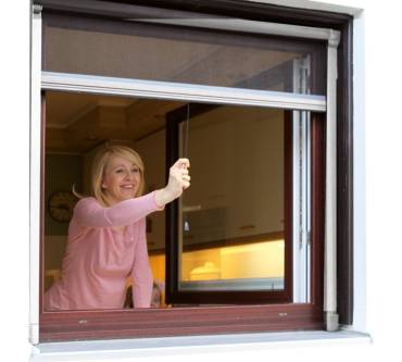 Das Fenster-Fliegengitter vom Hersteller Jarolift wird zur Zeit bei Amazon in der der Standardgröße 90 x 160 Zentimeter für 40 Euro angeboten. Auch wenn die Standardgröße für die meisten Fenster passt: Das Rollo lässt sich auch kürzen. Hierfür ist allerdings etwas handwerkliches Geschick nötig. Es kann dann mit oder ohne zusätzliche Verschraubung im Fensterrahmen befestigt werden, wobei der Hersteller die zusätzliche Befestigung mit Schrauben empfiehlt, um einen sichereren Halt zu gewährleisten. Zum Öffnen verfügt das Rollo über Halteklammern, beim Schließen wird es durch eine Rücklauffeder wieder in den Kasten gezogen.