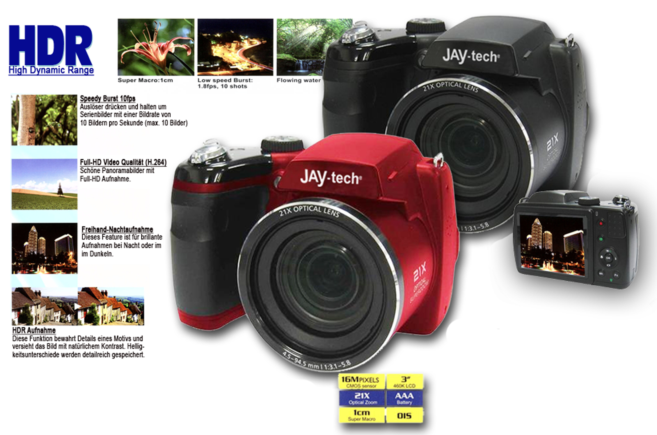 Pünktlich zum Weihnachtsgeschäft 2011 kündigt der Hersteller für besonders preiswerte technische Produkte Jay-tech eine Bridge-Kamera für nur 169 Euro an. Die in Schwarz und Rot lieferbare Kamera entspricht mit dem wuchtigen Objektiv und dem stark ausgebildeten Handgriff auf der rechten Seite den Vorstellungen, die man von einer Bridge-Kamera hat.