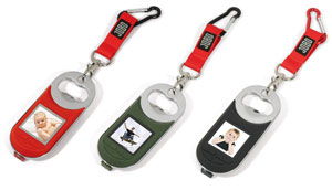 Nach dem sehr gut vermarkteten Bilderrahmen mit integriertem Schlüsselanhänger KeyFrame war es nur eine Frage der Zeit, bis Jobo ein ähnliches Modell mit einem eingebauten Flaschenöffner vorstellt. Der Rahmen ist zwar zu klein, um mit herkömmlichen SD(HC)-Karten arbeiten zu können, dafür bietet er einen internen Speicher, der für 60 JPEG-, BMP- oder GIF-komprimierte Aufnahmen ausgelegt ist. Die Fotos werden dabei wahlweise als Vollbild oder Diaschau auf dem 1,5 Zoll großen CSTN-Display mit einer Auflösung von 128 x 128 Pixeln dargestellt. Darüber hinaus ist das Gerät mit einem USB-Port ausgerüstet und kann in drei bis vier Stunden via PC voll aufgeladen werden.
