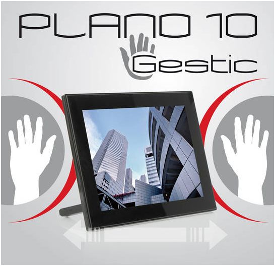 Der digitale Bilderrahmen Jobo Plano 10 Gestic ist der erste Bilderrahmen weltweit, der mit Hilfe von einfachen Handgesten gesteuert wird. Dazu muss der Besitzer lediglich die Hand oder den Finger etwa 15 Zentimeter dicht vor das 10,4 Zoll große Display halten. Mit einer Bewegung nach rechts blättert man dabei im Bilderalbum ''vorwärts''; richtet man die Hand auf den linken Bildschirmrand blättert man ''zurück''. Der Plano 10 Gestic zeigt außer Fotos auch noch Videos und spielt Musik ab. Die Auflösung beträgt 800 x 600 Pixel, liegt also etwa im Durchschnitt.